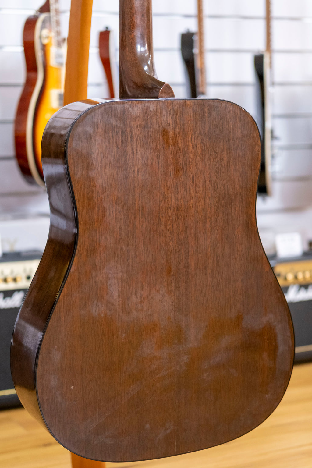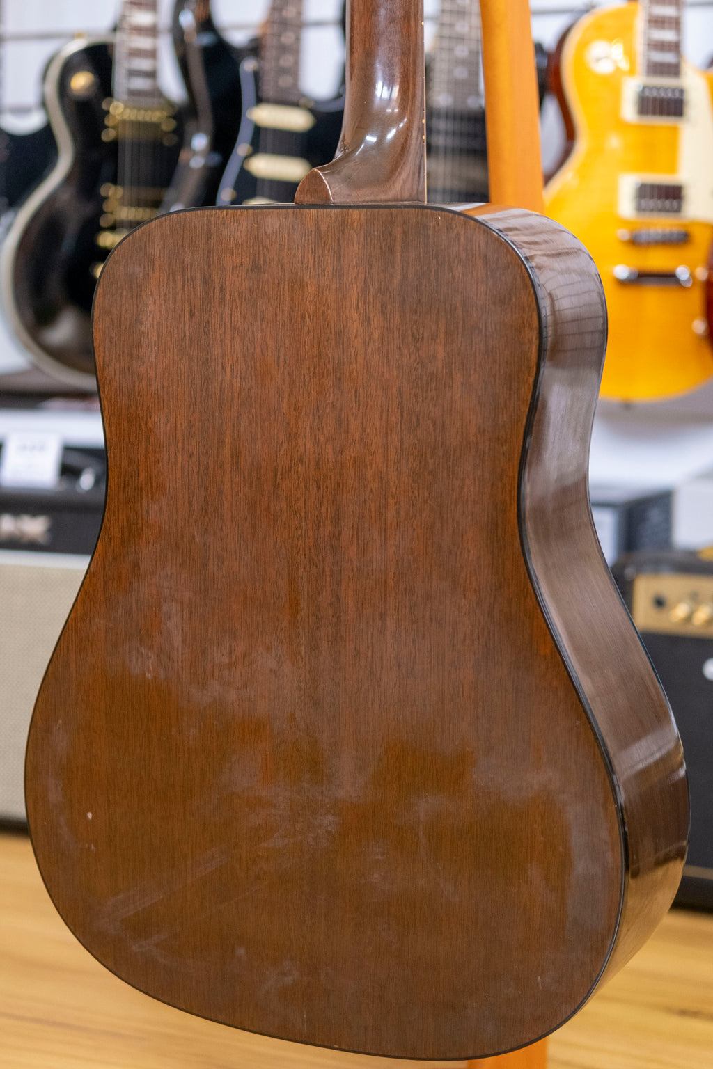 This 1970s Gibson J-50 Deluxe is a classic example of Gibson's craftsmanship from the renowned Kalamazoo factory. Spruce top with mahogany back and sides, delivers the warm, balanced tone that has made this model a favourite among players for decades. Rosewood fingerboard, 20 frets and has recently been refretted by Dalby, ensuring smooth playability. While a previously glued crack near the soundhole was not professionally repaired, the guitar remains structurally intact. It comes with a Gibson hard case, making it a great option for collectors or players looking for a vintage workhorse with character.