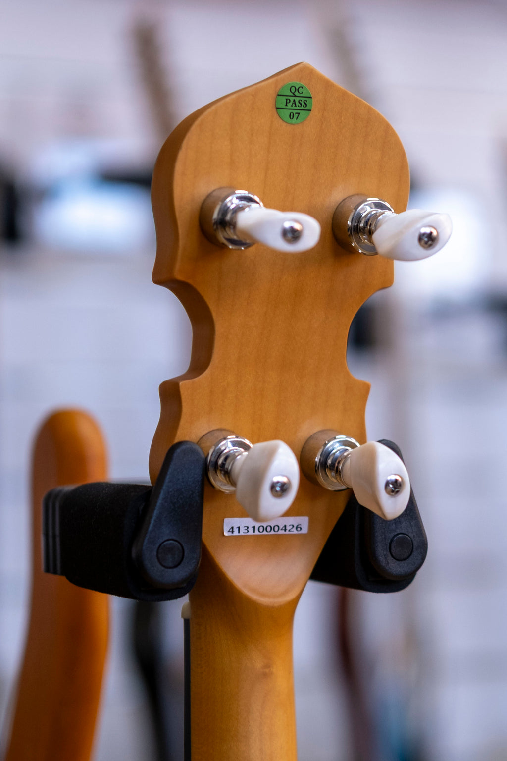 Solid spruce body. Spruce neck with Purpleheart fingerboard, two way truss rod and pearl dot inlays. 22 frets. 12 bracket, adjustable through body and 8" Remo Weatherking head. Ovangkol bridge. Chrome tailpiece. Chrome planetary tuners and geared 5th peg with pearloid buttons. Chrome humbucker pickup with volume and tone controls. Natural satin.