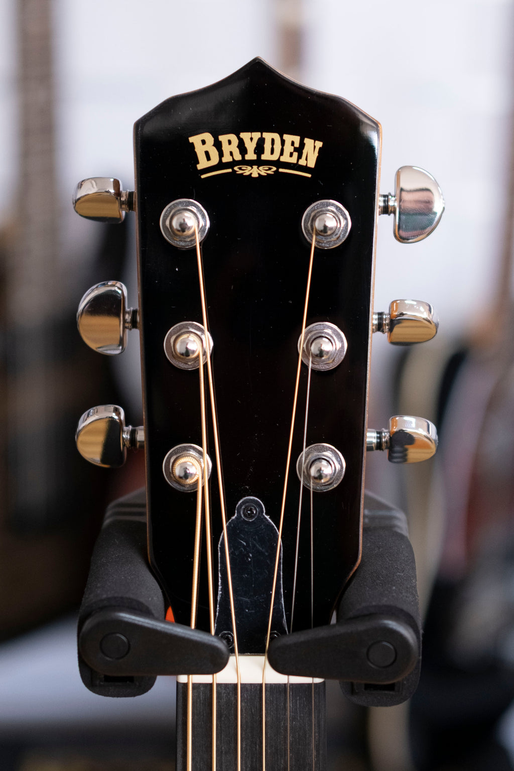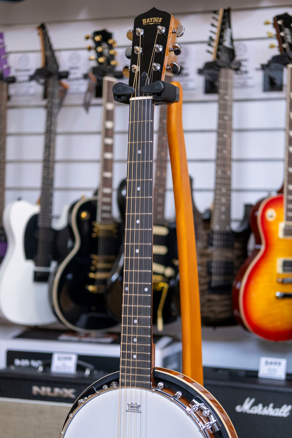 Ivory bound striped mahogany resonator. Mahogany neck with rosewood fingerboard, two way truss rod, ivory binding and pearl dot inlays. 22 frets. Laminated mahogany rim. 24 brackets. Remo head. Bridge with compensated rosewood saddle. Chrome arm rest and tailpiece. Chrome diecast machine heads.