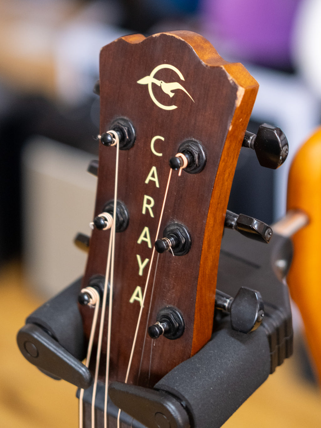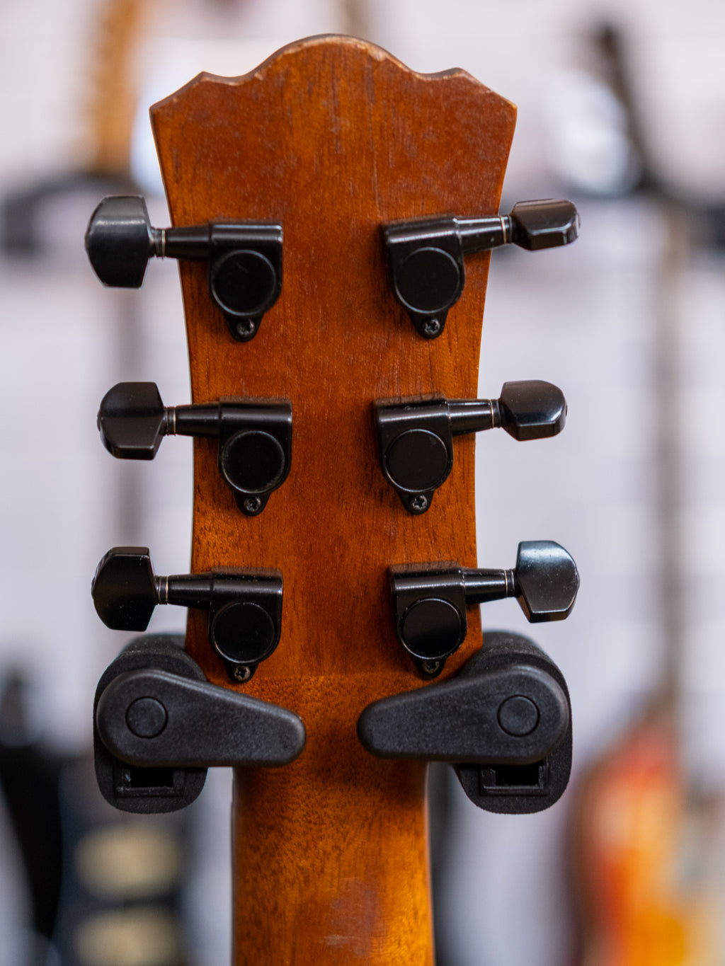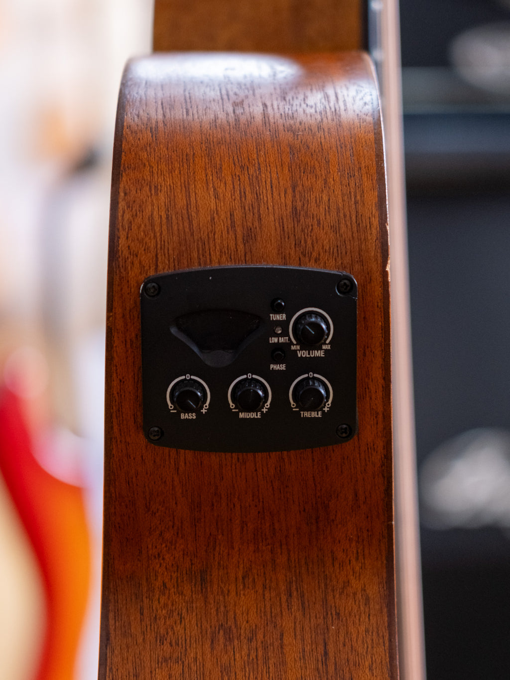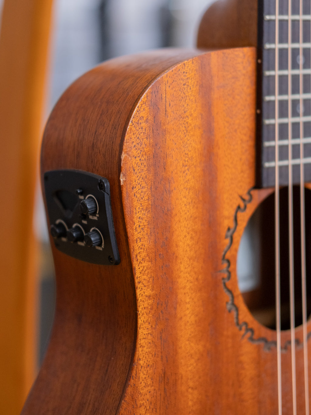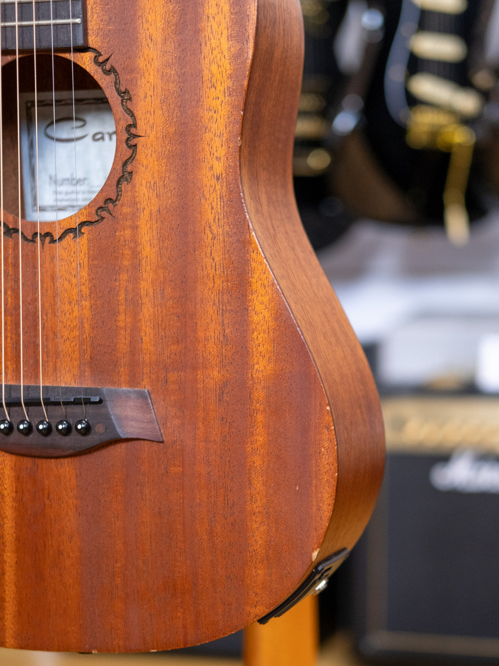 This 2017 Caraya Safari 34" EQ is a lightweight, all-mahogany travel dreadnought built for portability without sacrificing tone. With its satin finish, custom laser-etched rosette, and MOP “circle” inlays on the rosewood fingerboard, it’s a compact guitar with plenty of character. The 568mm scale and 42mm nut make it comfortable to play, while the built-in 3-band EQ and tuner let you plug in anywhere.