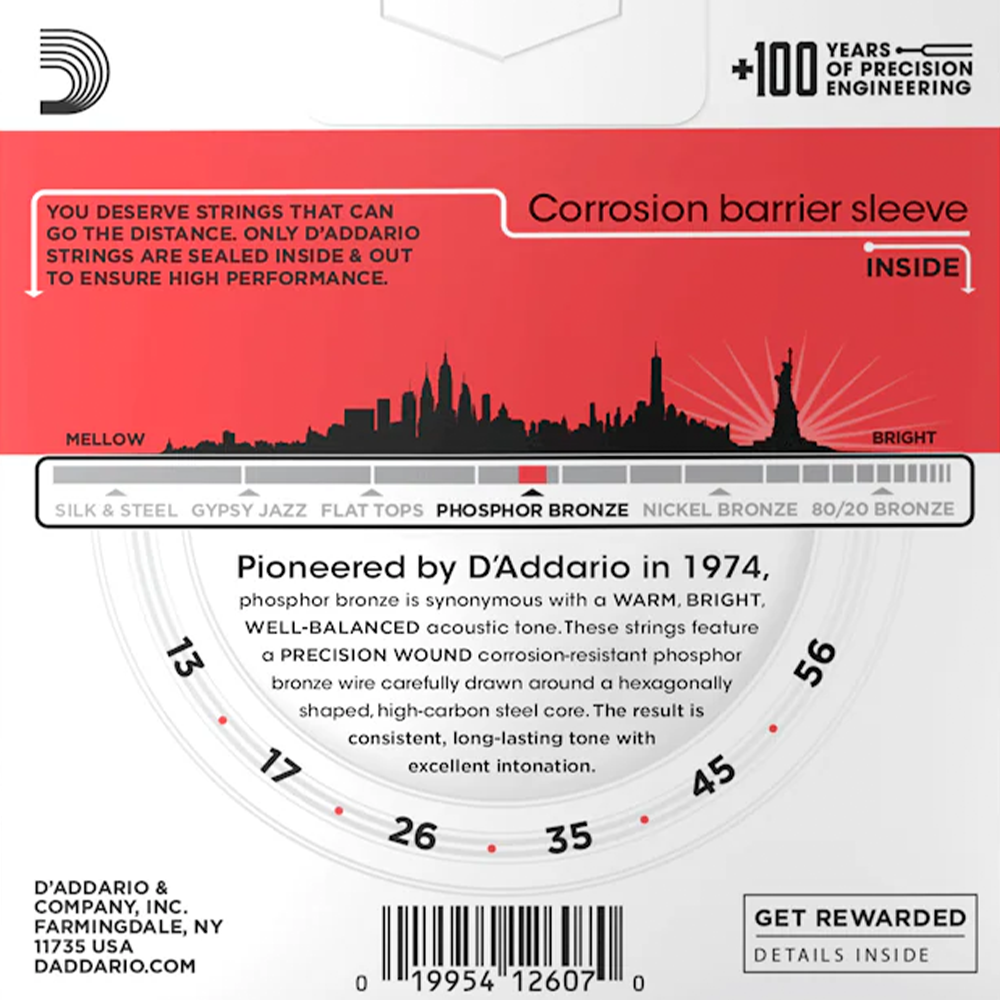 D'Addario was the first to use Phosphor Bronze in acoustic guitar strings back in 1974. Today, Phosphor Bronze is played throughout the world and considered to be the standard in acoustic strings, thanks to its beautiful sonic balance and tonal warmth. Our pioneering Phosphor Bronze acoustic guitar strings are precision wound with phosphor bronze wrap wire over a high-carbon steel core, providing tonal versatility suitable for all acoustic styles and musical genres. 13-56 Medium gauge strings provides maximum volume and projection, with more tension and resistance.