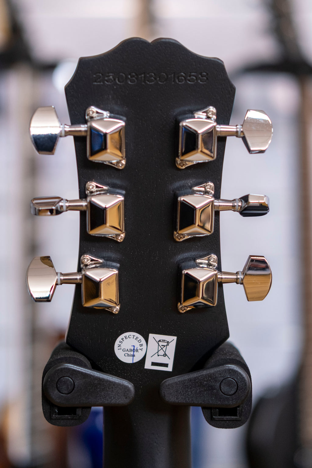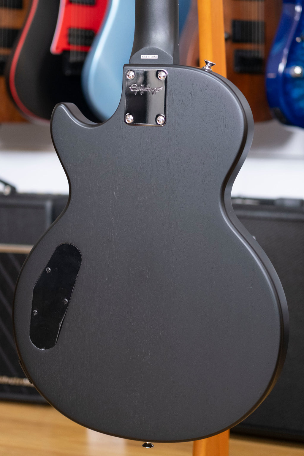 - Headstock Epiphone Clipped Ear; Les Paul Model in gold; Epiphone logo in silver