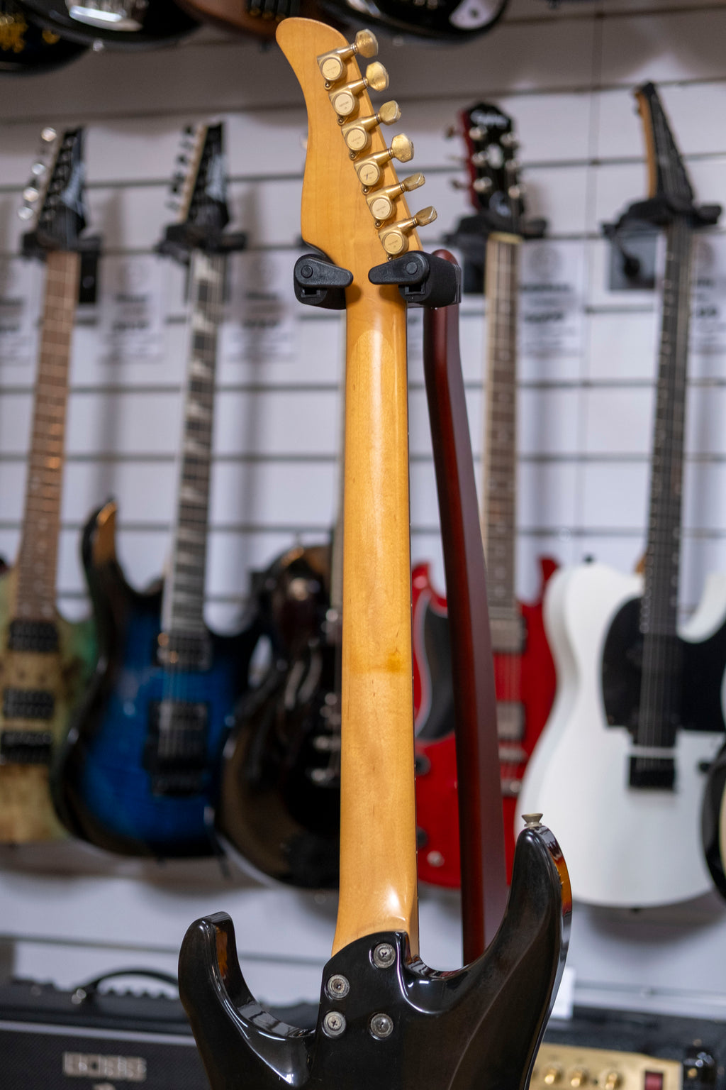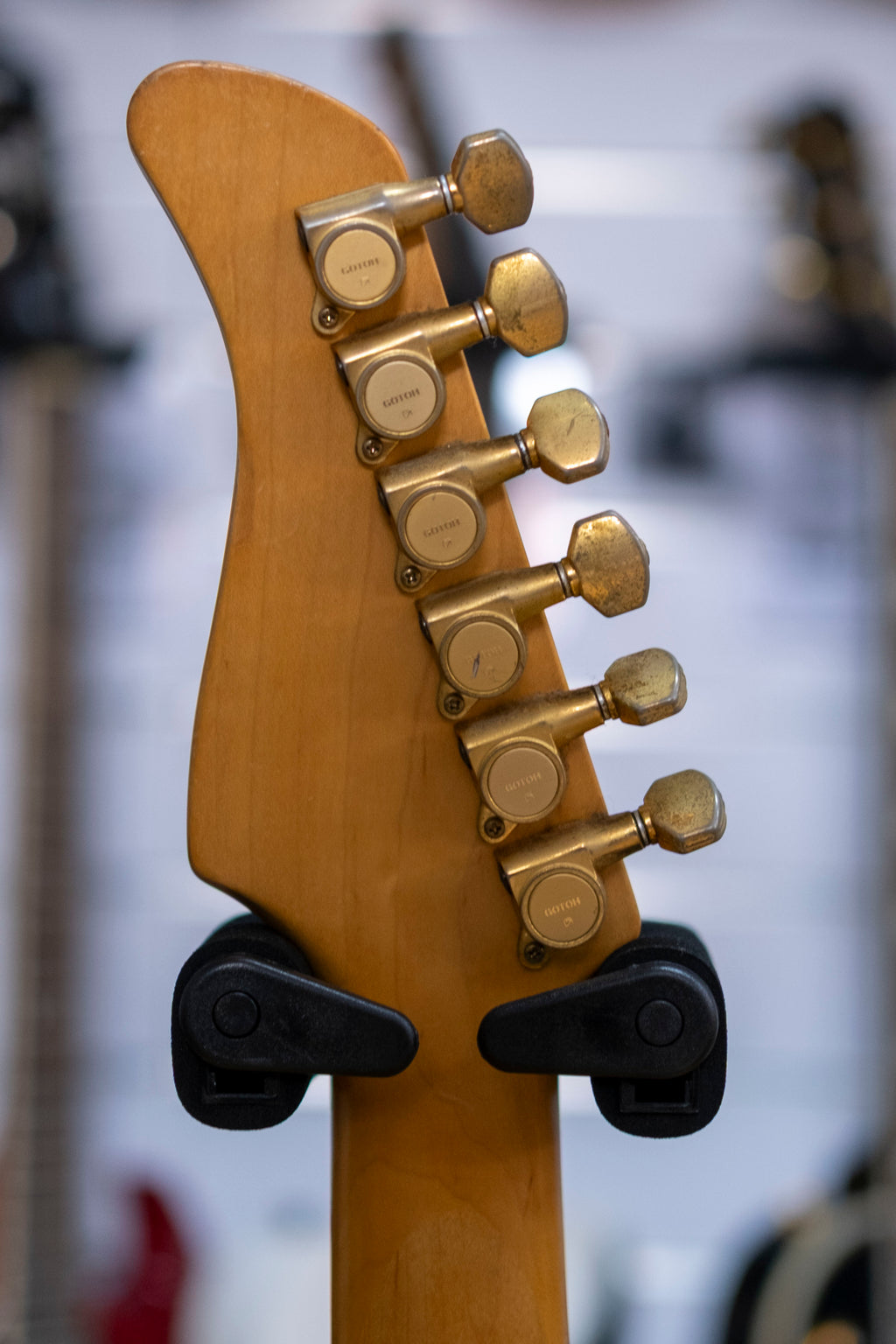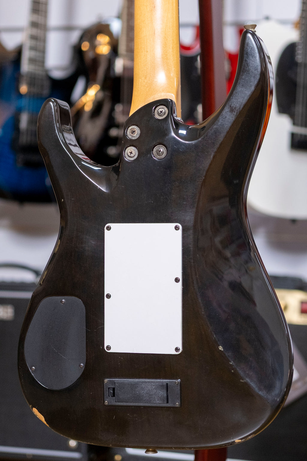 It needs a fret dress, with visible fret wear and grooves. The original active pickups are long gone and it’s currently loaded with two Evans single coils and an unbranded humbucker. Pots have been swapped out and are non-original.