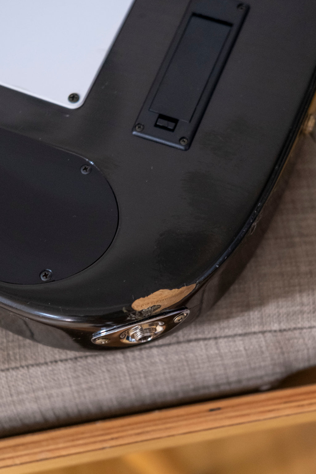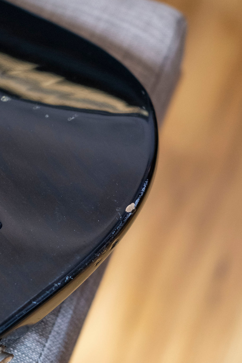 The locking nut hardware is also non-original, but does include the tremolo arm. There’s damage on the lower bout near the input jack, purely visual, nothing structural.