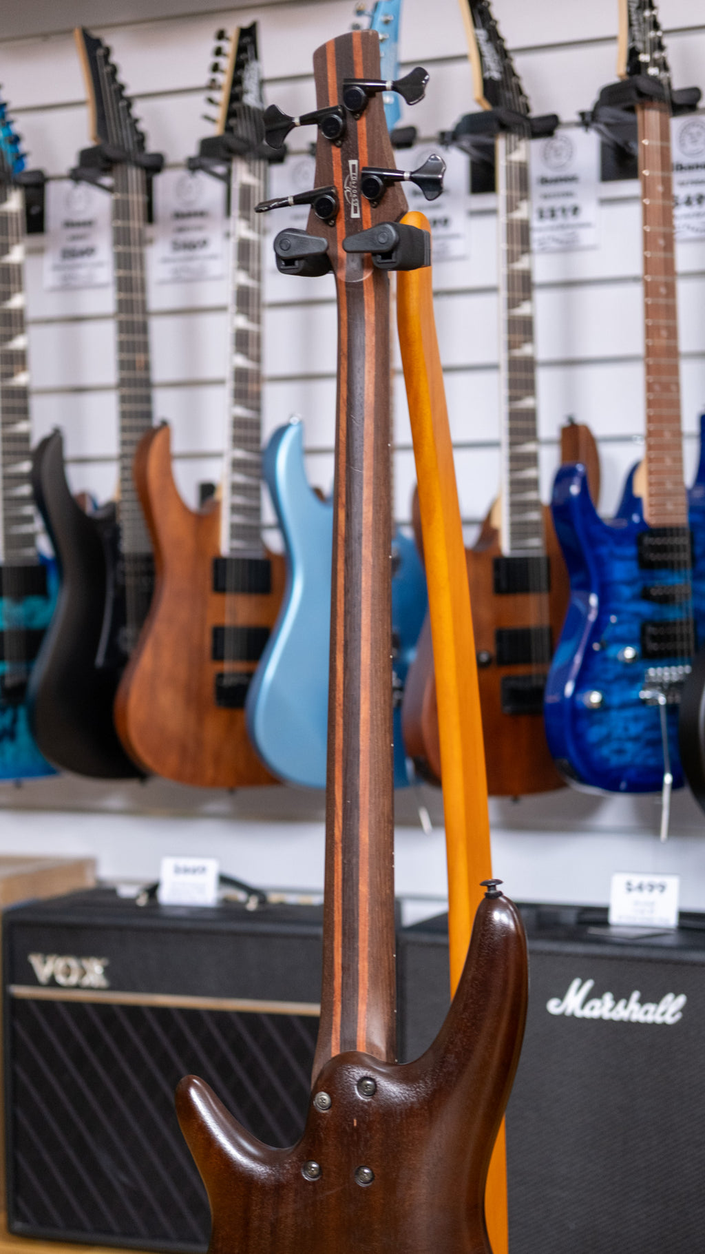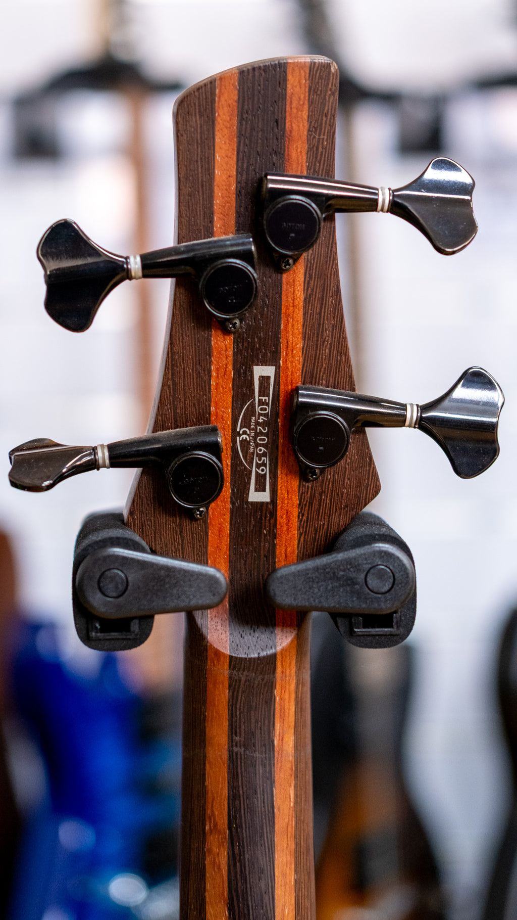 The SR750F features a double-cutaway mahogany body bolted to a wenge and bubinga neck with a 24-fret rosewood fretless fingerboard with (painted frets) and a black headstock. Components include an Accu-cast B20 fixed bridge with 19mm string spacing, and a pair of Ibanez DX-P/J pickup's chanelled to a Vari-mid 3LC (Active 3-Band Equalizer), a plastic nut, black hardware and gotoh tuning machines.