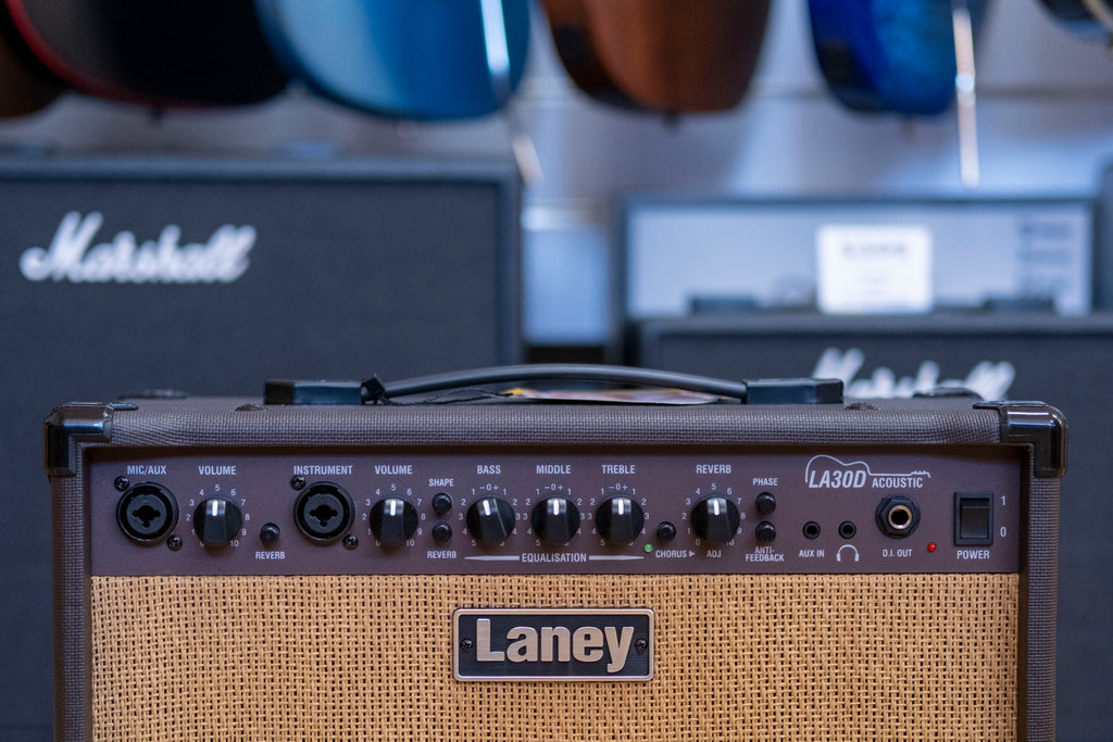 The Laney LA30D is a dual-channel 30W RMS acoustic amplifier combo, ideal for performance and rehearsal.