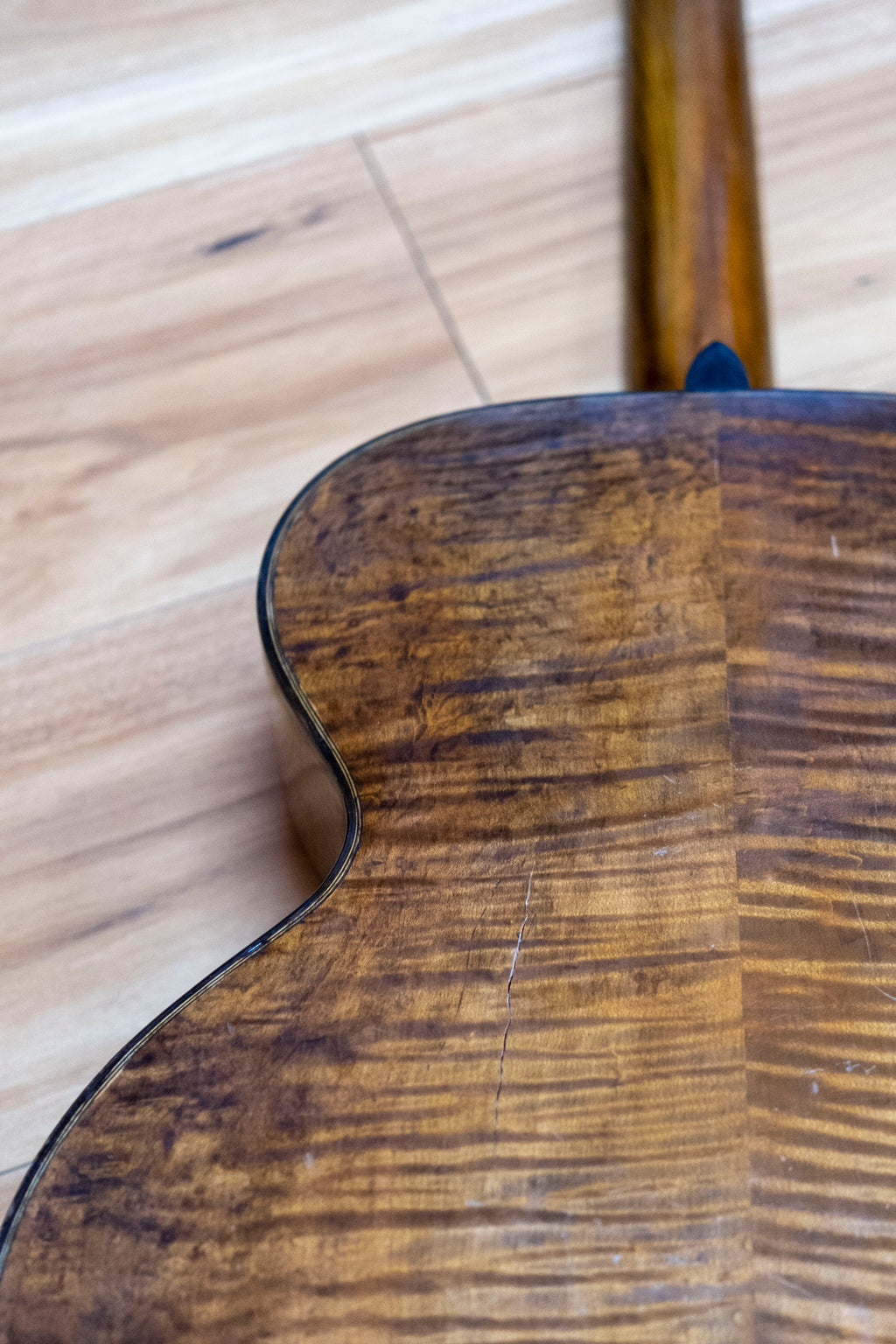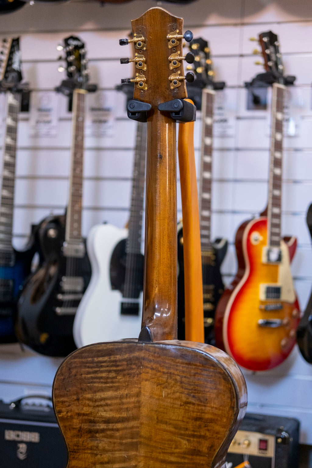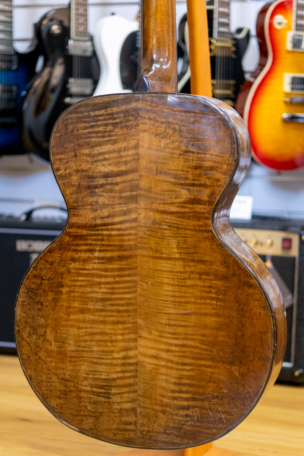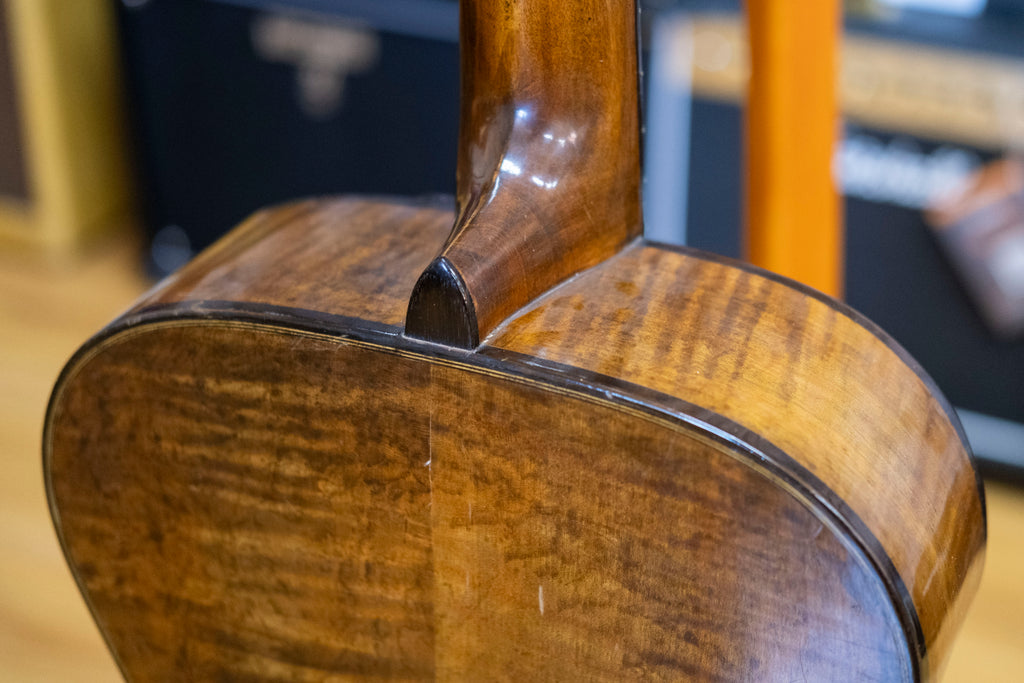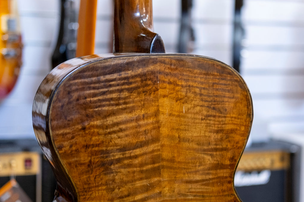 A proper old soul with stories to tell. This 1948 Melody No. 26 appears to have a solid top, back and sides. It's had a full setup with a fret dress and new tuners. The neck has a twist and a bit of buzz, most noticeable on the G string between frets 7 to 12. Overall decent condition, but it does have two cracks on the back.