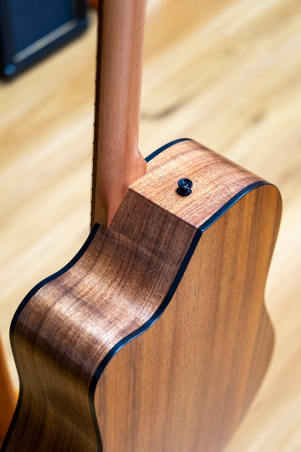 The fretboard is also a floating fretboard with its end sitting just above the soundboard. Many companies compromise the soundboard geometry to create the correct angle to glue on the fretboard. Others machine the fretboard thin to thick to create the angle. Pratley Guitars keep the full thickness of the neck & fretboard through, past the last fret and then allow the fretboard to float above the top. Traditional stringed instruments such as violin & cello also do this as it allows the maker to focus on the voice of the soundboard without compromise.