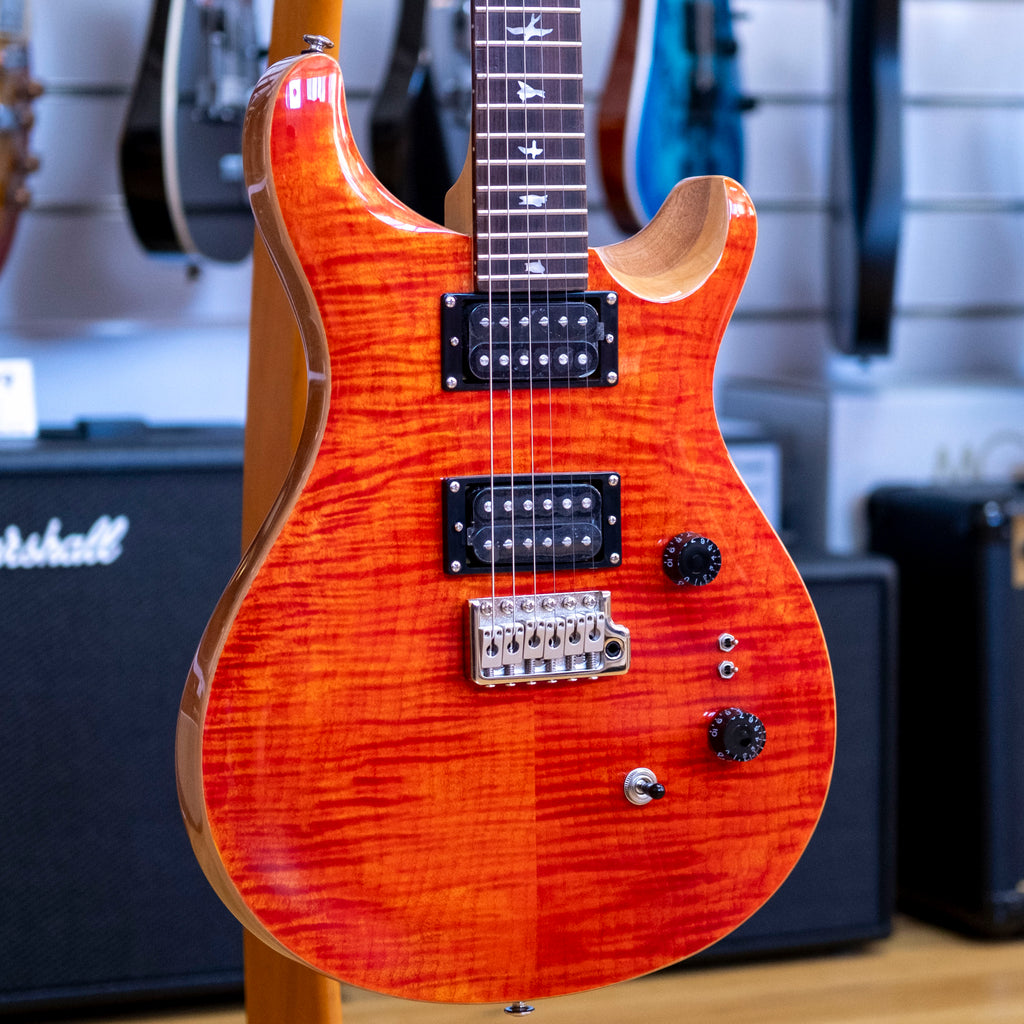 The Custom 24 is the quintessential PRS guitar: the iconic guitar that started it all back in 1985. The Custom 24-08 keeps all the foundational specs of the instrument, while taking the Custom platform to new sonic territories. Like the Core Series instrument, the SE Custom 24-08 features two mini-toggle coil-split switches that individually split the humbuckers into true single coils for a total of eight pickup configurations. Classic design elements include a maple top, mahogany back, rosewood fretboard, 24 frets, 25” scale length, bird inlays, signature headstock logo, and PRS patented molded tremolo.