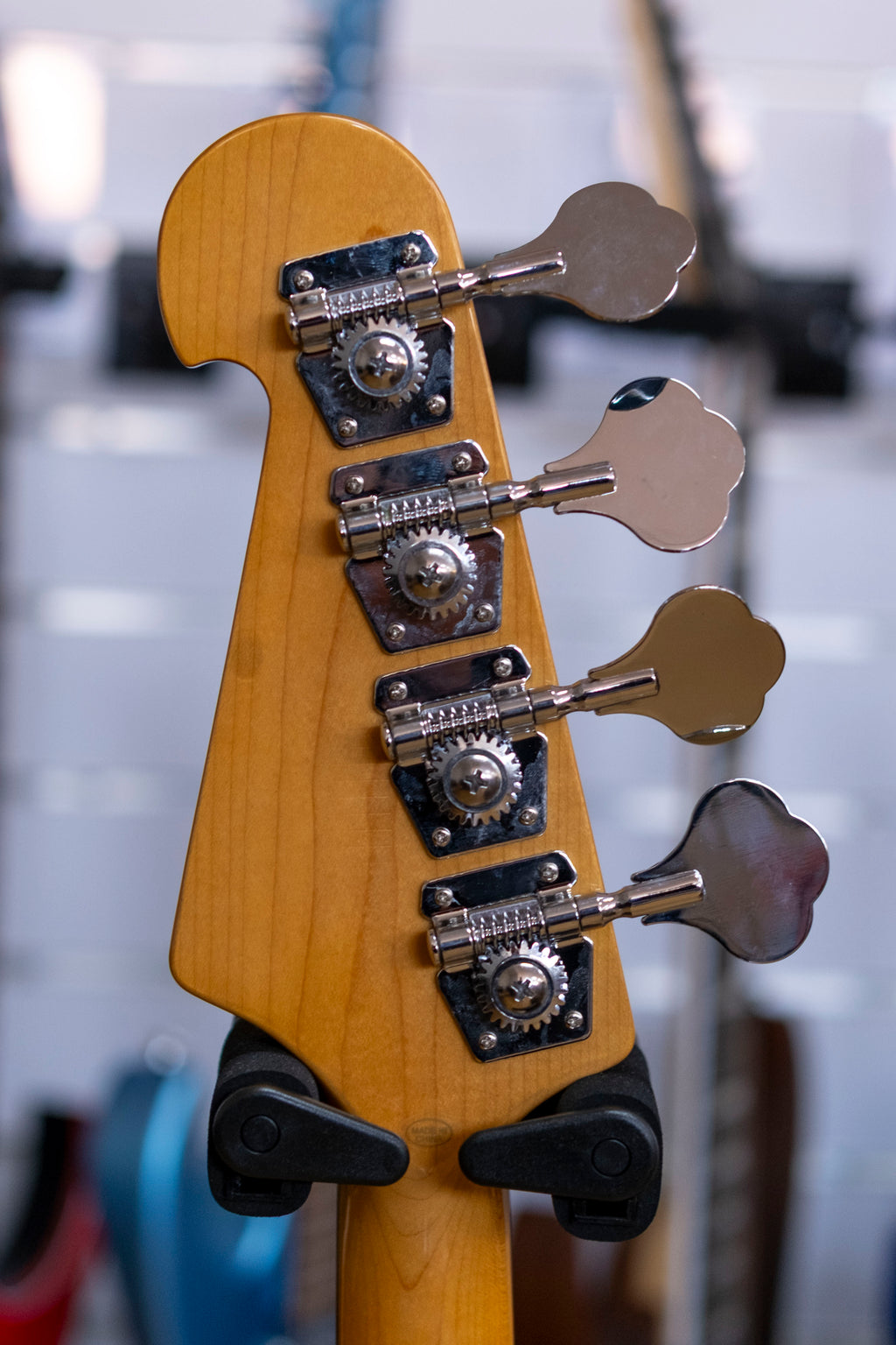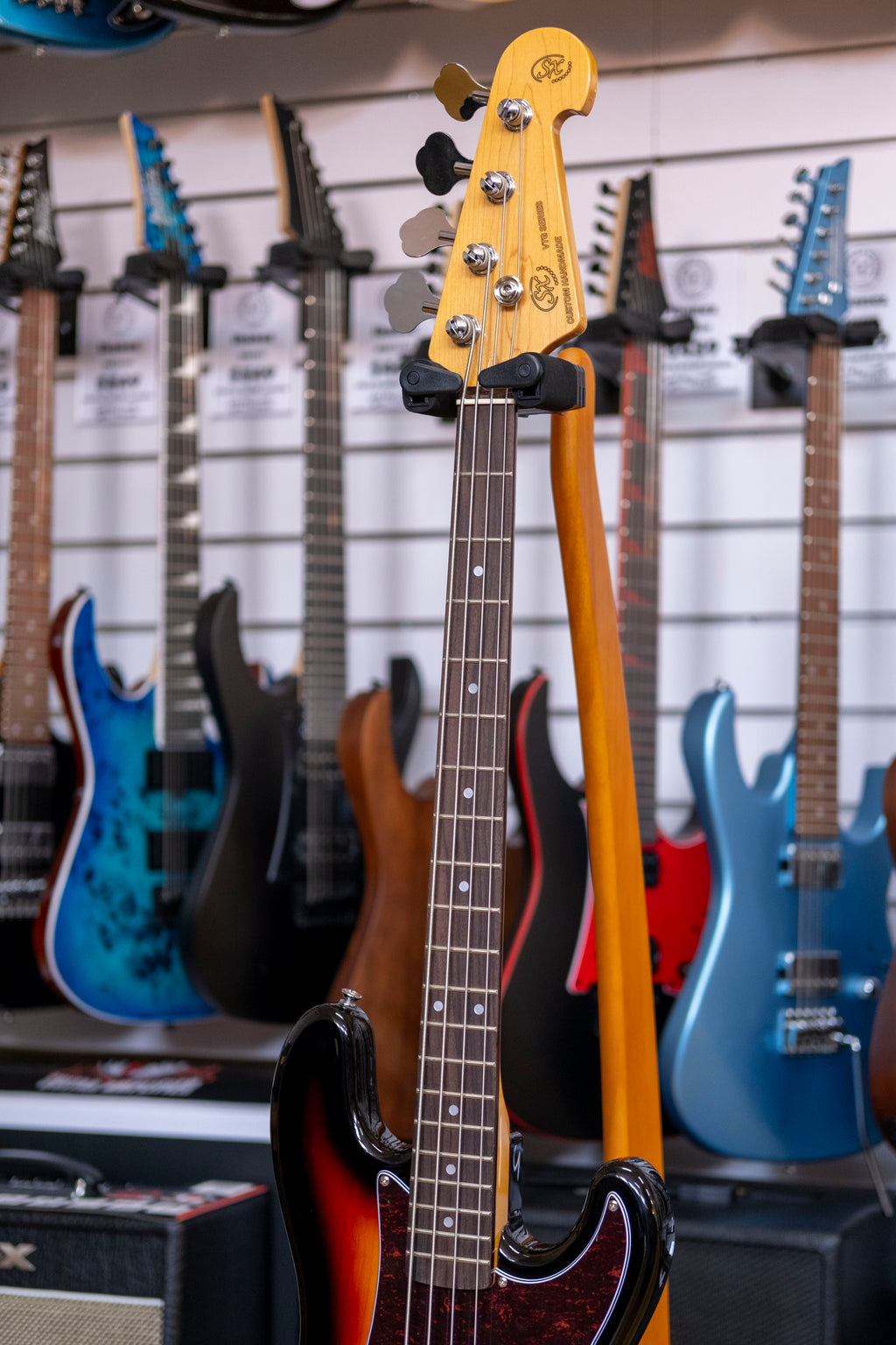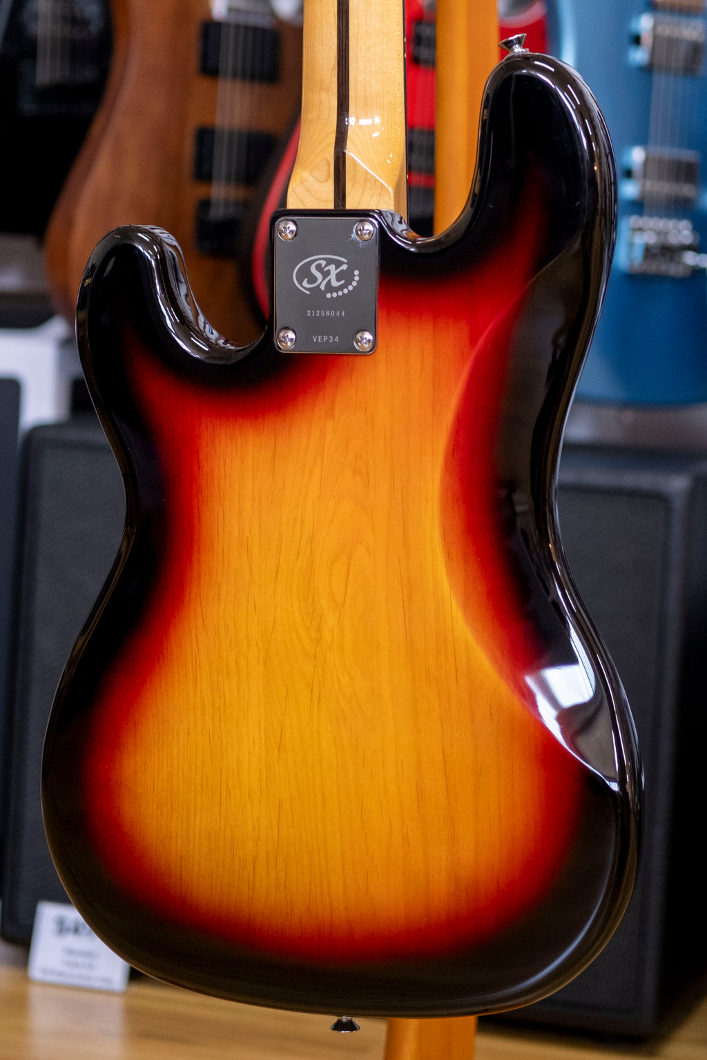 The SX VEP34 3/4 Short Scale Bass Guitar is a vintage style bass guitar with traditional solid basswood body. It features a maple neck with rosewood fingerboard, 20 frets, 30″ scale, P-bass pickup, volume and tone controls with chrome knobs, tortoiseshell 3 ply scratchplate and chrome vintage machine heads and bridge. It also includes an SX padded gig bag, so you’re ready to rock with your bass anywhere – lessons, school, home, or a jam session!
