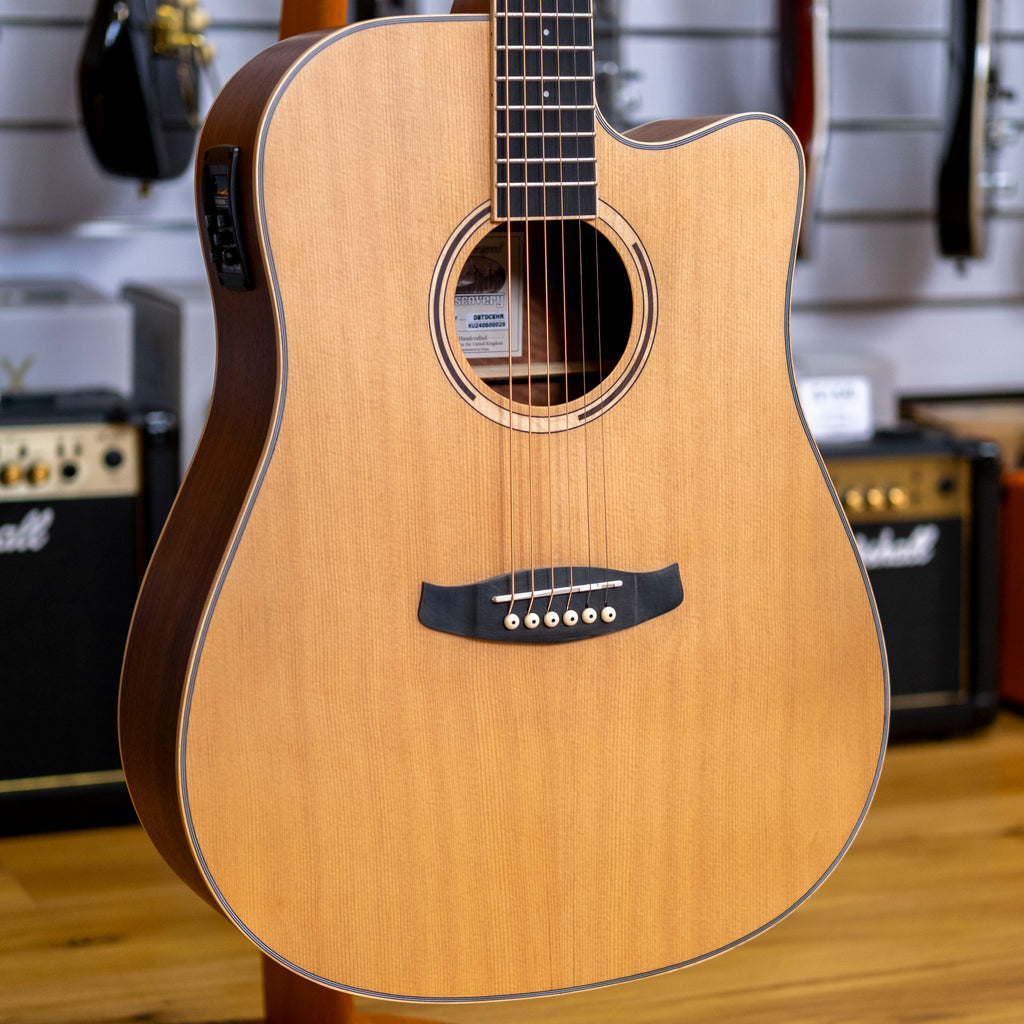 The range comes in dreadnought, folk, super folk and left hand models so you are sure to find the one to meet your needs! Our deluxe model features all ebony wood, super folk cutaway / electric, maple binding and a natural gloss finish.