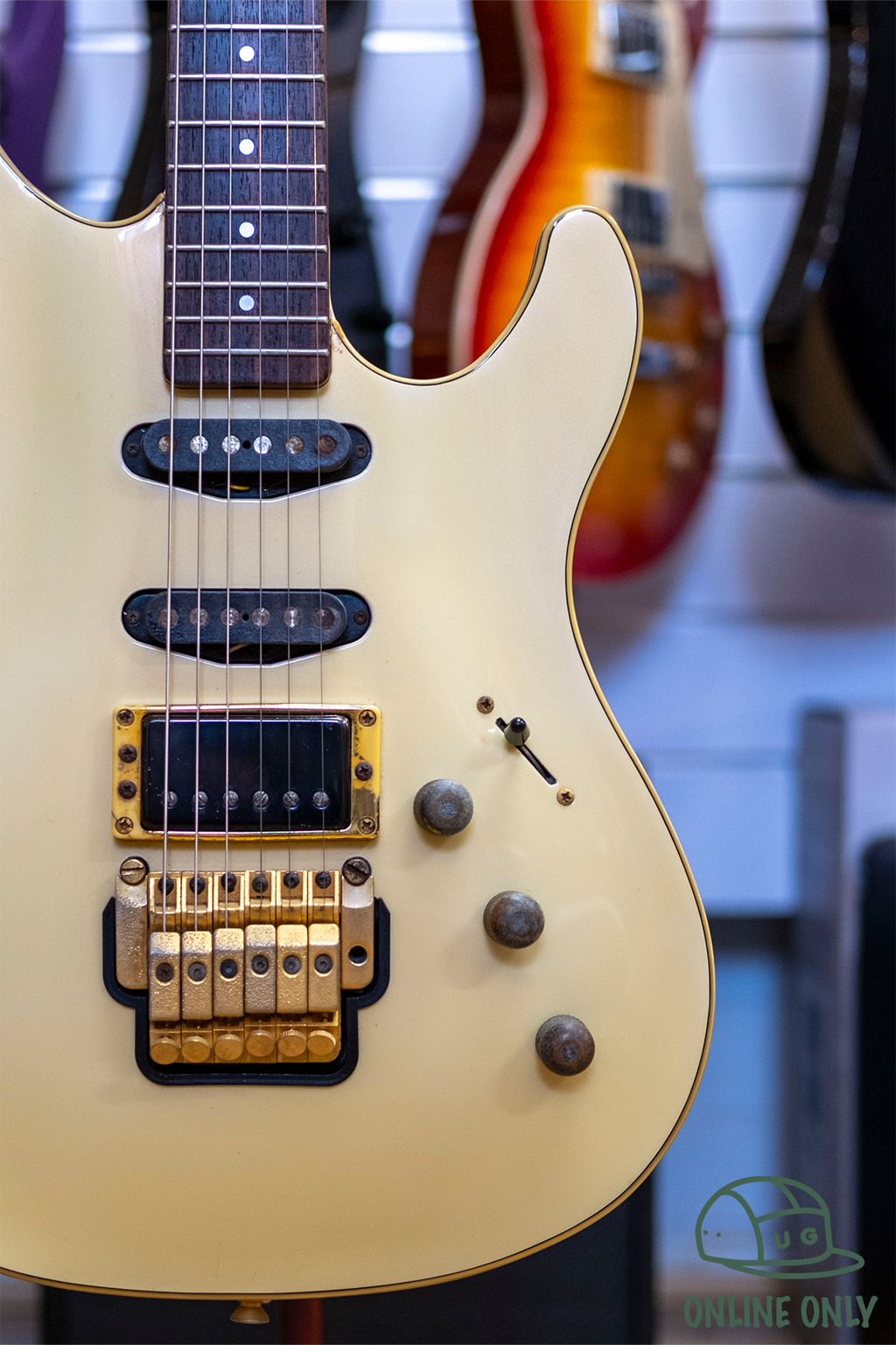 Made in Japan. Classic ’80s Yamaha with an H-S-S pickup configuration. All original aside from replaced locking nuts. The neck and middle pickup pole pieces show some surface rust, and the high-E fine tuner on the Floyd Rose is slightly bent but still fully functional.